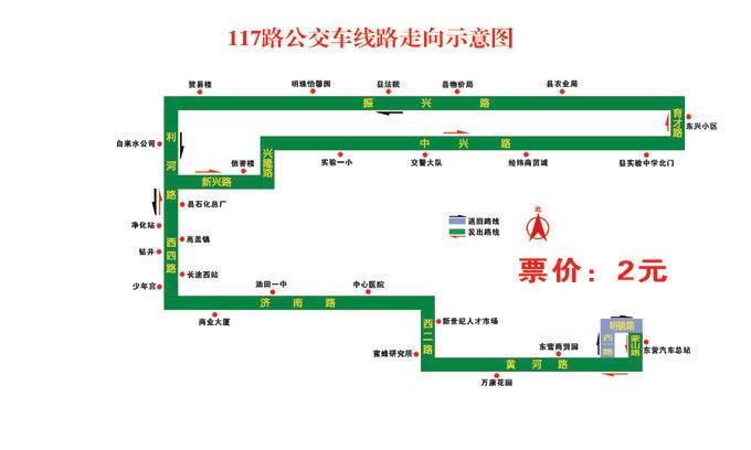 117路:自東營(yíng)長(zhǎng)途汽車(chē)總站始發(fā),途經(jīng)蒙山路、黃河路、西二路、濟(jì)南路、西四路、利河路、新興路、興隆路、中興路、育才路、振興路、利河路、西四路、濟(jì)南路、西二路、黃河路、西一路、明鏡路、蒙山路、到達(dá)終點(diǎn)站東營(yíng)長(zhǎng)途汽車(chē)總站,票價(jià)不變,仍為2元/人次;