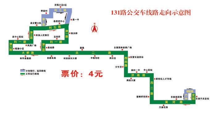 131路:自東營(yíng)長(zhǎng)途汽車(chē)總站始發(fā),途經(jīng)蒙山路、黃河路、西二路、濟(jì)南路、西四路、北二路、大橋路、津六路、利一路、津三路、利五路、津一路、利一路、津二路、大橋路、北二路、西四路、濟(jì)南路、西二路、黃河路、西一路、明鏡路、蒙山路、到達(dá)終點(diǎn)站東營(yíng)長(zhǎng)途汽車(chē)總站,票價(jià)不變,仍為4元/人次。