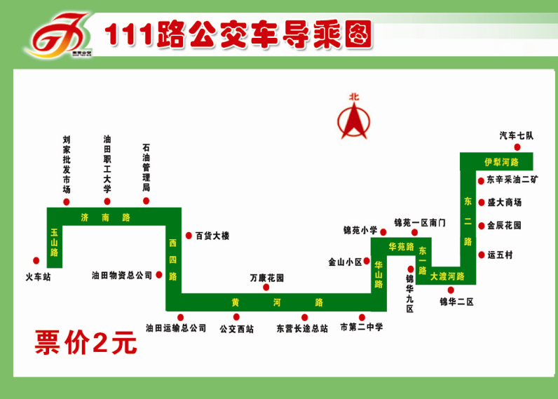 111路:該線路自汽車七隊(duì)始發(fā),經(jīng)伊犁河路(華瑞小區(qū))、東二路(盛大商場(chǎng)、運(yùn)五村)、大渡河路(錦華五區(qū))、東一路(錦華九區(qū)),改經(jīng)華苑路(錦苑一區(qū)南門、錦苑小學(xué))、華山路(金山小區(qū)),到達(dá)黃河路后,恢復(fù)原線路,單程里程24.3公里,票價(jià)、班次均不變。