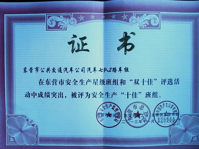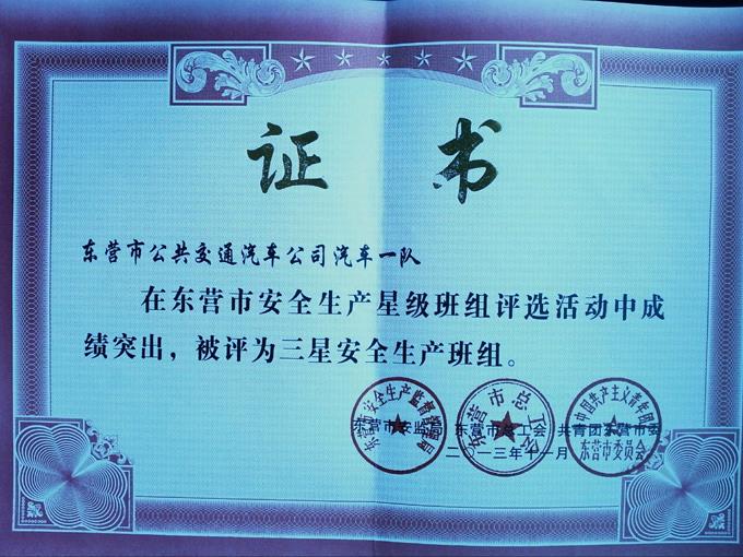 2012年開始,市公交公司按照安全生產(chǎn)標準化要求,不斷完善、補充安全檔案資料,在今年市安全生產(chǎn)監(jiān)督管理局、市總工會、共青團東營市委組織的創(chuàng)建星級安全生產(chǎn)班組和十佳班組活動中,市公交公司汽車一隊、汽車七隊2路車組分別被評為三星安全生產(chǎn)班組和安全生產(chǎn)十佳班組。