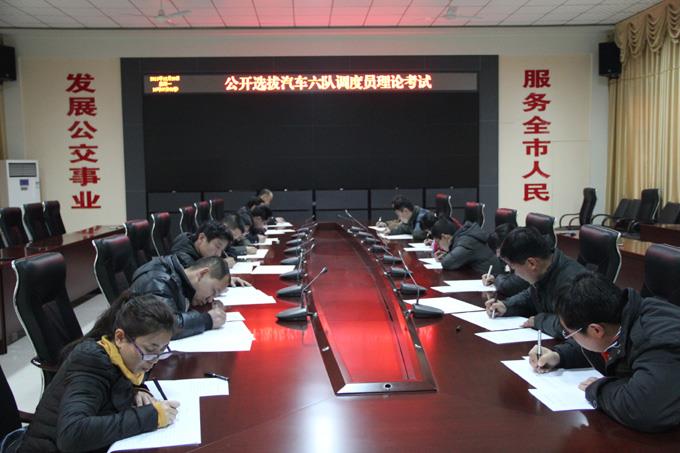 2013年12月底,市公交公司汽車六隊(duì)3名調(diào)度員公開選拔理論考試在公司一樓會(huì)議室開考,符合申報(bào)條件的15名員工,在規(guī)定時(shí)間內(nèi)按照給定的5個(gè)題目,圍繞調(diào)度職責(zé)、如何做好運(yùn)營(yíng)調(diào)度工作等相關(guān)內(nèi)容進(jìn)行了認(rèn)真答卷。本著公開、公正的原則,由公司領(lǐng)導(dǎo)班子、人事科長(zhǎng)、所在車隊(duì)負(fù)責(zé)人組成的評(píng)委對(duì)密封試卷現(xiàn)場(chǎng)評(píng)分后,對(duì)理論成績(jī)排名前6名的同志當(dāng)場(chǎng)進(jìn)行了民主評(píng)議。最后,張東衛(wèi)、張光輝、潘志紅3名同志理論成績(jī)、民主評(píng)議綜合得分排名居前三位。經(jīng)過(guò)3天公示無(wú)異議后,3名同志已于2014年1月3日到崗培訓(xùn)。