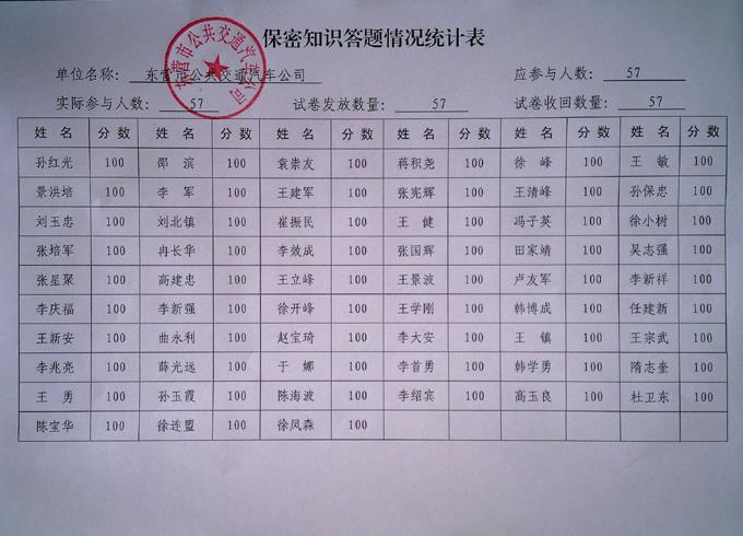 今年是新修訂保密法頒布5周年,保密法實(shí)施條例頒布1周年,也是全國(guó)“六五”保密普法教育收官之年。為進(jìn)一步增強(qiáng)公司管理干部保密法制觀念,提升管理干部綜合管理水平,市公交公司于6月5日至10日組織公司57名管理干部參加了全省保密知識(shí)答題活動(dòng)。答題方式采取試卷答題卡方式進(jìn)行,合格率均達(dá)到了100%。