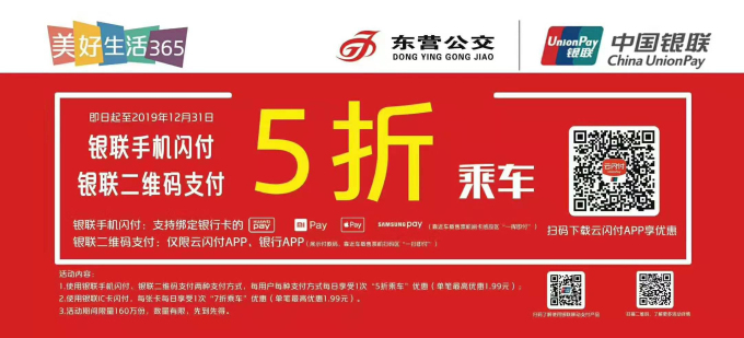 為倡導(dǎo)綠色低碳出行環(huán)境,讓市民充分享受到公交優(yōu)先發(fā)展的成果,自即日起至12月31日,市公交公司聯(lián)合銀聯(lián)再次推出便民服務(wù)舉措。市民使用銀聯(lián)手機(jī)閃付、云閃付APP二維碼或各銀行APP二維碼支付兩種支付方式,每用戶每種支付方式每天享受1次“5折乘車”優(yōu)惠(單筆最高優(yōu)惠1.99元);使用銀聯(lián)IC卡閃付每卡每天享受1次“7折乘車”優(yōu)惠?;顒悠陂g優(yōu)惠總額160萬元,先到先得,滿額為止。