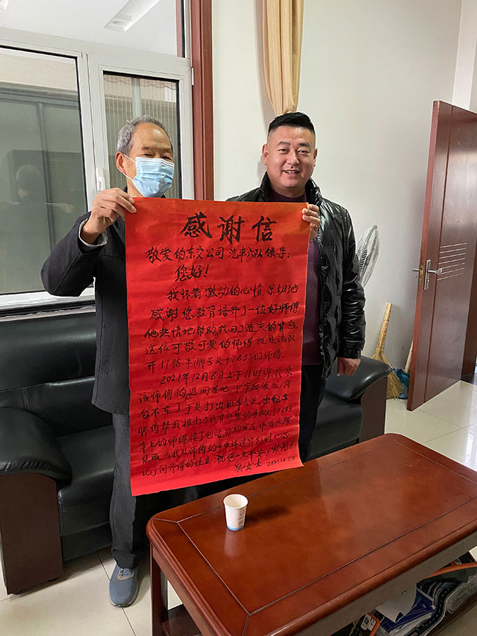 12月9日上午,東營市公交公司汽車六隊(duì)的辦公樓里來了兩位手捧大紅色感謝信的老人家。上面寫著“感謝您教育培養(yǎng)了一位好師傅,他熱情地幫助并找回了遺失的背包?!?br/> 原來,在12月8日上午,家住西城的吳女士和老伴從墾利區(qū)返程時(shí)乘坐了袁永文師傅駕駛的117路公交車,在到達(dá)濟(jì)南路附近下車后,發(fā)現(xiàn)自己的隨身斜跨的背包不見了。這時(shí)才想到可能是遺落在剛剛的公交車上,“雖然是個(gè)小破包,里面也就一百來塊錢,可是手機(jī)、鑰匙、老年卡都在包里?!被叵肫甬?dāng)時(shí)發(fā)現(xiàn)背包丟失后的吳女士非常著急,“手機(jī)還是孩子剛給買的,還新得很呢”。焦急的吳女士便跑到附近的濱海派出所去詢問該如何,“人家給我出了個(gè)主意,打上出租車去追”。吳女士和老伴便急忙攔上了一輛出租車去追趕。吳女士說自己老伴平時(shí)出門也不帶電話,幸虧出租車駕駛員人也很好,用自己的電話撥打了吳女士背包里的手機(jī)。當(dāng)時(shí)還在駕駛車輛的袁永文師傅并不知道這一切,當(dāng)他聽到車廂內(nèi)有電話聲響,經(jīng)乘客提醒得知有個(gè)背包在座位上,考慮到可能是失主在尋找。袁師傅便在下一站把車??柯愤吅?,從包里拿出電話,撥了回去,這樣雙方才取得了聯(lián)系。