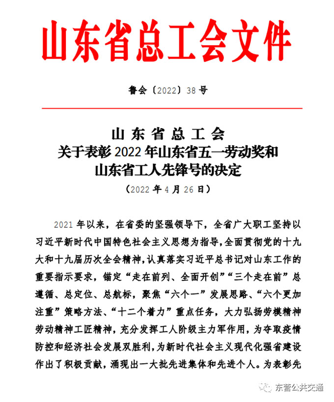 為進(jìn)一步激勵(lì)廣大職工在新時(shí)代勇?lián)率姑宫F(xiàn)新作為,“五一”前夕,山東省總工會(huì)和東營(yíng)市總工會(huì)先后印發(fā)通報(bào)表彰,對(duì)省市多家先進(jìn)集體和個(gè)人進(jìn)行表彰,東營(yíng)市公共交通汽車(chē)公司駕駛員黃新強(qiáng)同志被評(píng)為山東省五一勞動(dòng)獎(jiǎng)?wù)?,東營(yíng)市公共交通汽車(chē)公司9路車(chē)組被評(píng)為東營(yíng)市工人先鋒號(hào)。