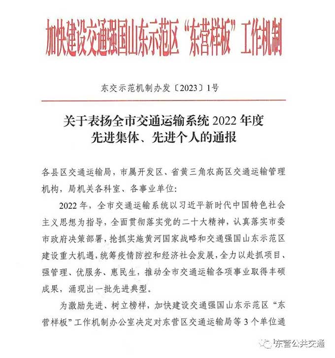 會上,加快建設(shè)交通強國山東示范區(qū)“東營樣板”工作機制辦公室印發(fā)了2022年度全市交通運輸工作交通先鋒先進(jìn)集體及先進(jìn)個人表彰決定。市公交公司、市公交公司辦公室、市公交公司保修二廠獲得交通先鋒先進(jìn)集體榮譽稱號,2名同志獲得交通先鋒先進(jìn)個人榮譽稱號。
