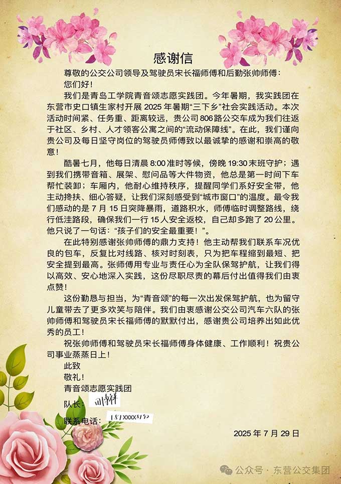 原來,在今年的暑假期間,青音頌志愿實踐團在東營市史口鎮(zhèn)生家村開展2025年暑期“三下鄉(xiāng)”社會實踐活動,負責(zé)本次806路班車任務(wù)的宋長福細致入微的服務(wù),讓志愿團的師生深受感動。宋長福師傅在執(zhí)行本次班車任務(wù)過程中,自清晨8:00的準時等候,到傍晚19:30分的守護,從幫助師生搬運大件行李,到行車中的安全提醒,細心答疑,特別是在7月15日突降暴雨時及時調(diào)整路線,規(guī)避積水區(qū)域,為保障了師生15人的安全返校,給予了最大的安全守護!