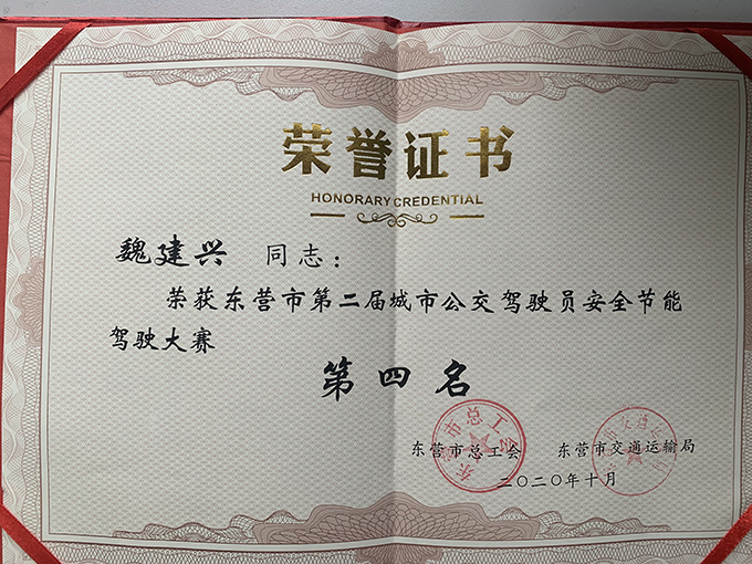 魏建興榮獲“東營市第二屆城市公交駕駛員安全節(jié)能駕駛大賽第四名”