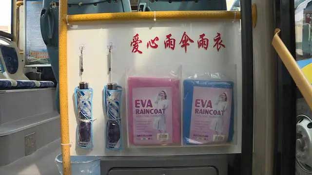 在東營市公交公司汽車三隊(duì)停車場,駕駛員李斌像往常一樣,把自己駕駛的38路公交車仔仔細(xì)細(xì)打掃了一遍。記者在他的車上,還看到了一些特別的便民物品:前排的礦泉水、藥箱,后排的便民雨傘、雨衣。李斌告訴記者,這些都是他自己購置安裝的,就是為了方便乘客。