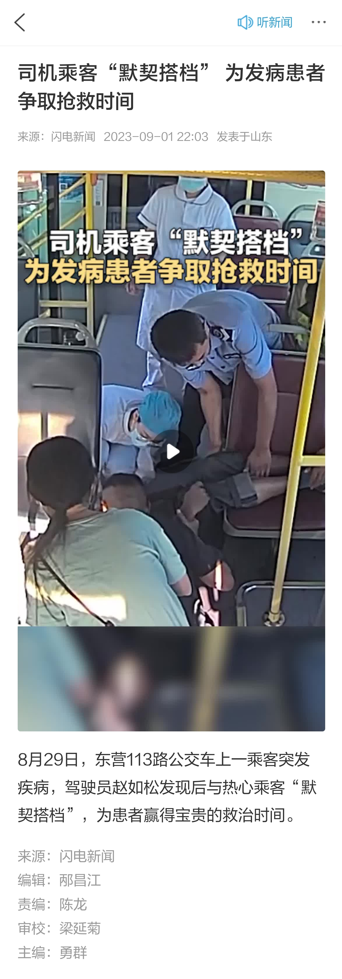 2023年8月29日下午4點58分左右,正在駕駛113路公交車的趙如松聽到了車內(nèi)乘客的呼救。他從車內(nèi)后視鏡看過去,發(fā)現(xiàn)車內(nèi)一男性乘客正在渾身抽搐,然后倒地不起,此時,坐在他后方的一名乘客見狀,立馬跑到駕駛員旁邊呼救。趙如松師傅馬上靠邊停車,并上前查看乘客情況,因接受過急救培訓(xùn),趙師傅立馬判斷,該乘客可能是突發(fā)疾病,在向公司匯報并征得車內(nèi)乘客同意后,立即將公交車開往醫(yī)院,為患者爭取急救時間。車輛到達到市人民醫(yī)院南門后,趙如松和急救人員合力將患者抬到急救擔(dān)架上,一起送到急救室,看著他情況穩(wěn)定后,才返回工作崗位駕車駛離。